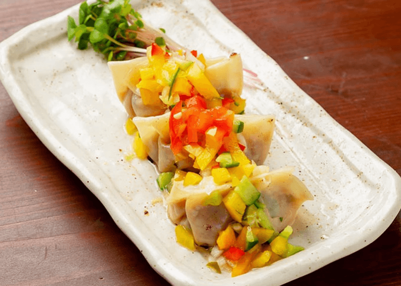 さっぱりとしたピクルスがたっぷり乗った餃子です。