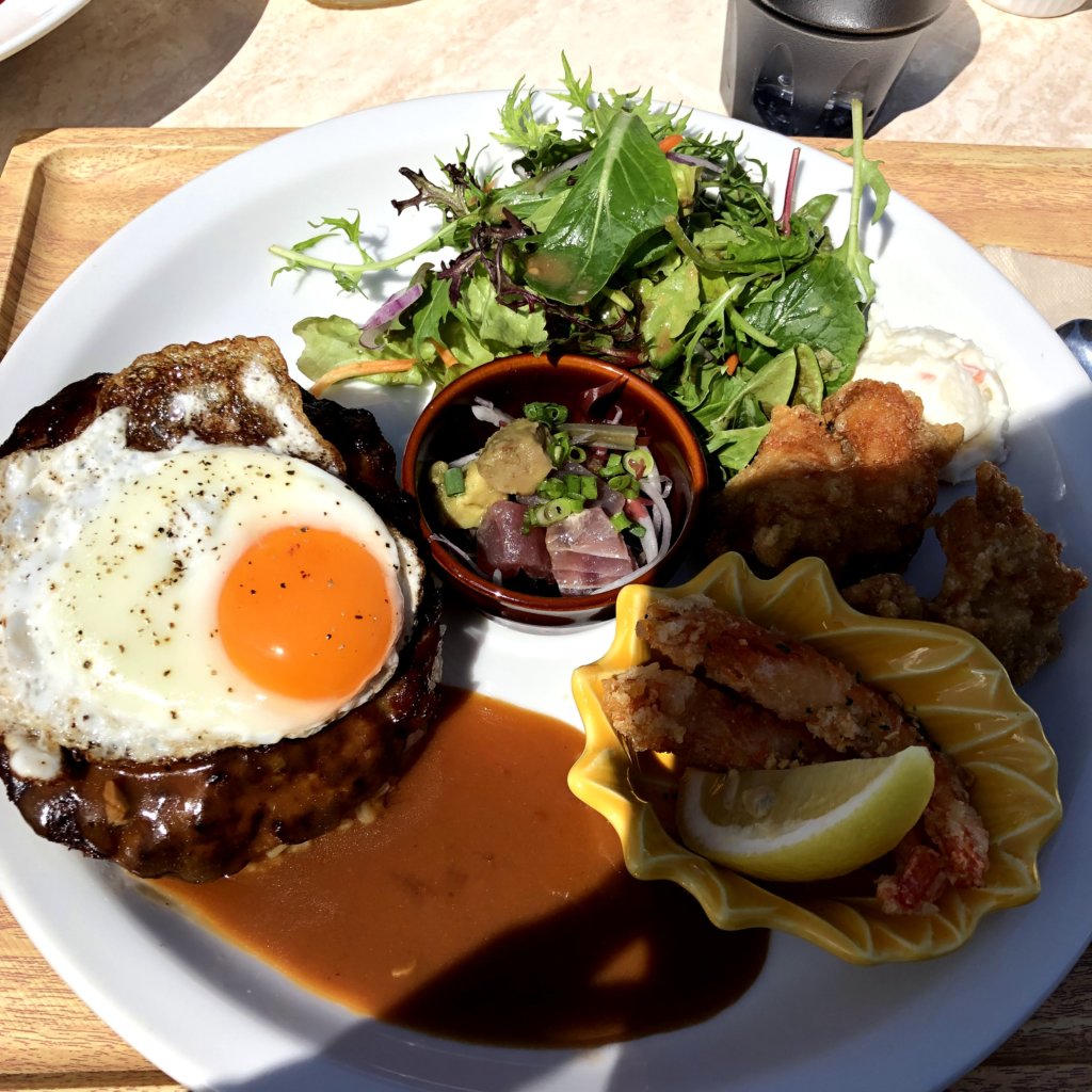 ロコモコ、アヒポキ、鶏のから揚げ、ガーリックシュリンプ、