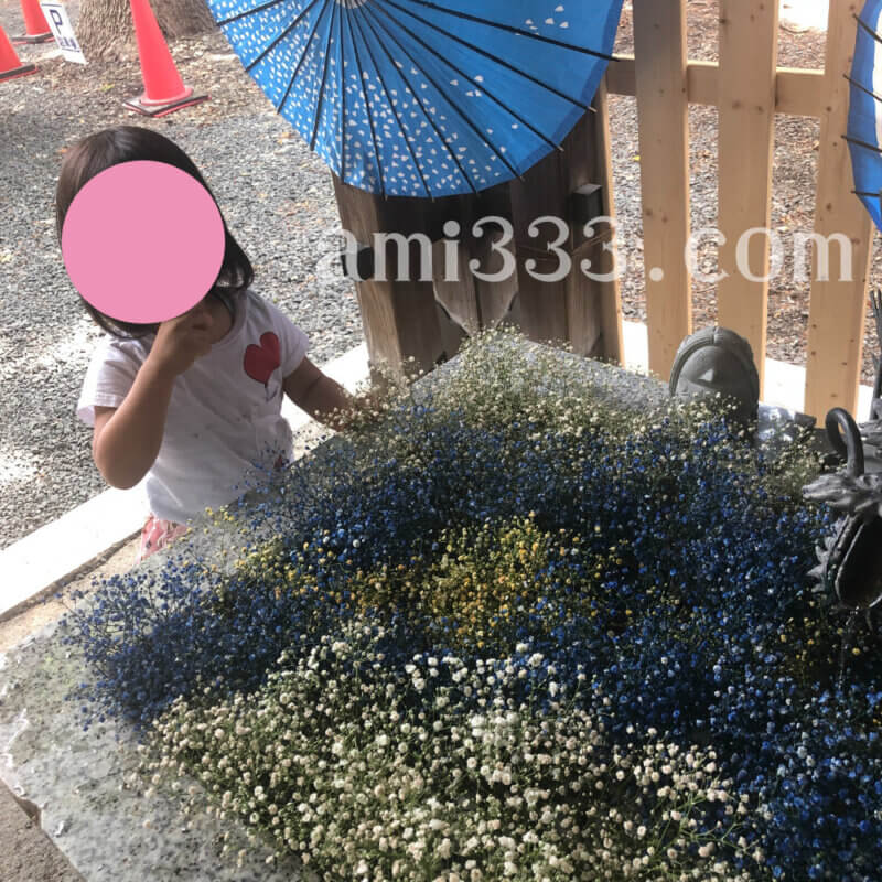 今までなかった感じのかすみ草のシックな花手水、とても素敵でした♪